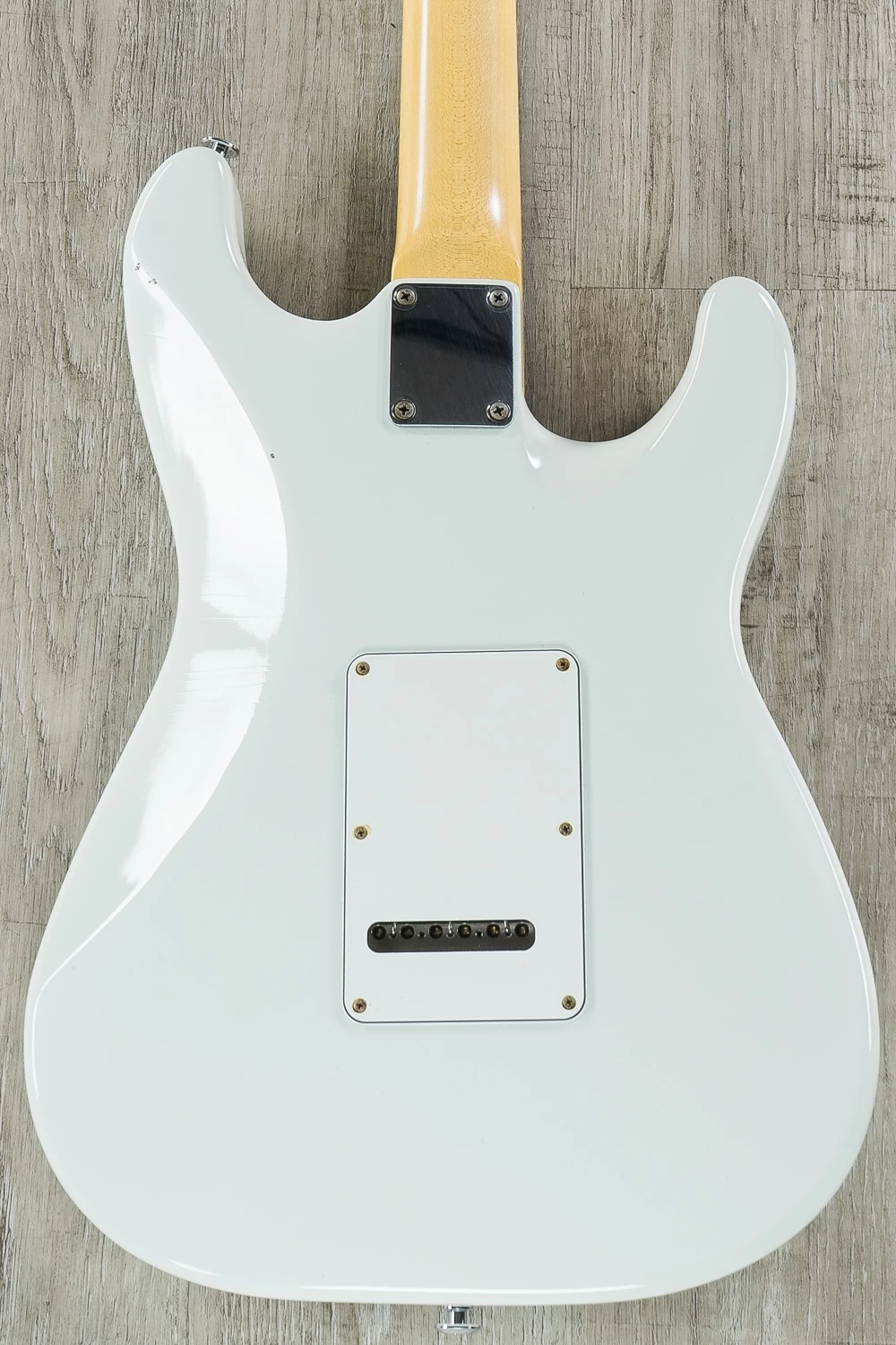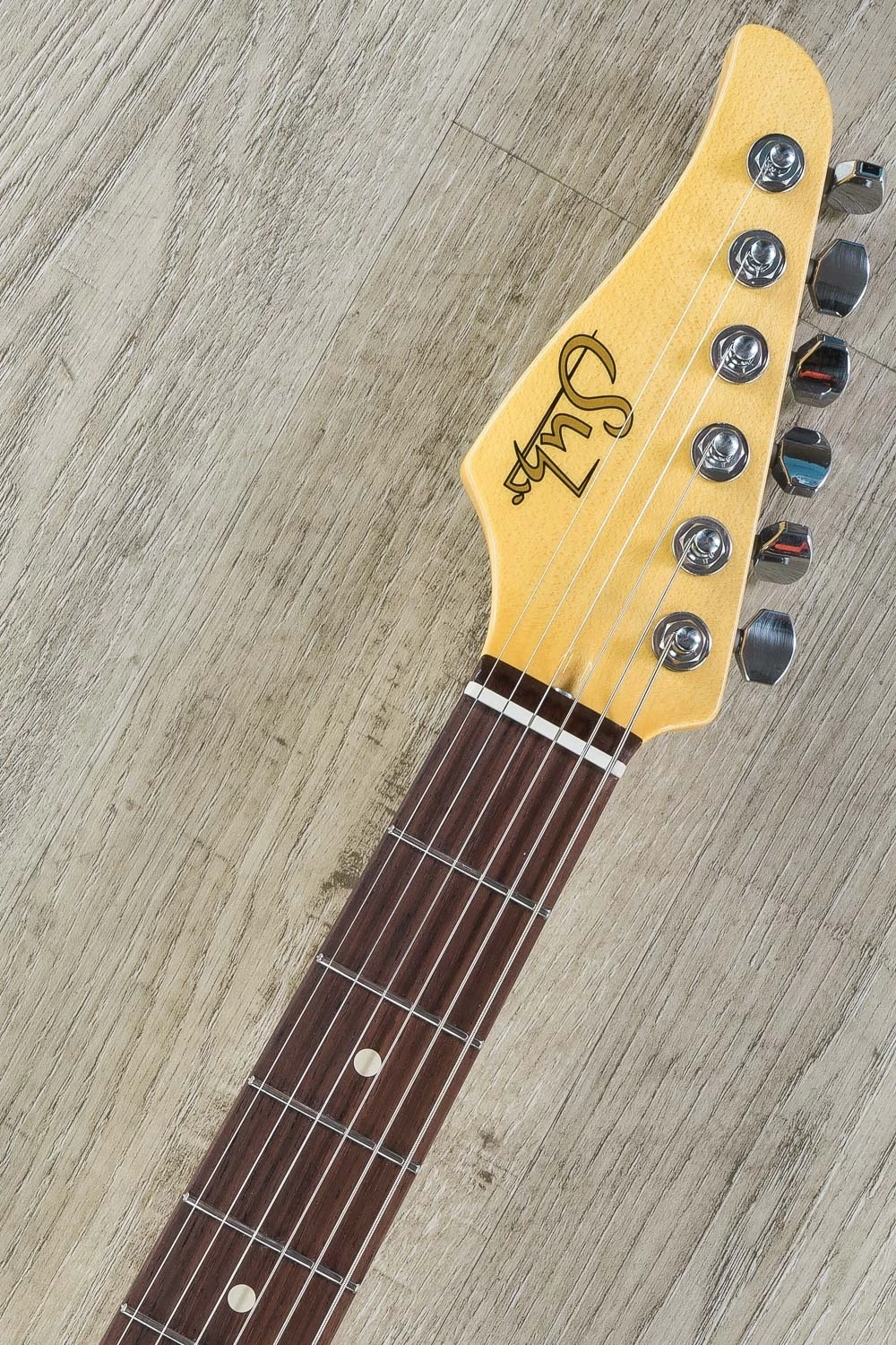If you’re looking at this, chances are you’re already familiar with the impeccable reputation that Suhr have built for themselves over the years. Known for their high-end boutique hot-rodded guitars, the craftsmanship and playability of these guitars is unparalleled. If you’re looking for something that will be reminiscent of that Strat you had back in the day but want it to play and sound like it was put together with some of today’s finest guitar builders… Well, you can stop your search right here! This guitar has a vintage look, but make no mistake that this isn’t a vintage sounding strat. It’s nitro finish is checked and relic’d and the fretboard is tinted to complete the vintage aesthetics. The SSCii noise reduction system gives you silent (that’s right! No more messy 60-cycle hum when soloing a pickup) circuitry while still preserving a true single coil tone. The single coil pickups that are slightly overwound and will provide more output and sustain along with a bit of a mid-range bump to help keep your notes defined if you saturate them with distortion. The humbucker is thick and meaty sounding while still giving you tons of bite on the top-end. Vintage Strats can tend to have very thin and shrill sounding bridge pickups, but not this bad boy! This guitar makes no apologies for it”s aggressive sound, nor should it. It will cut through even the most dense of mixes so you can be heard the way you want to be and your tone won’t suffer. The compound radius fretboard makes the playability effortless and stainless steel frets ensure that you can own this guitar for decades without having to worry about getting it re-fretted. This guitar can really do it all. It sounds great clean, but really starts to shine as you add a bit of dirt to the tone. This axe truly rocks!