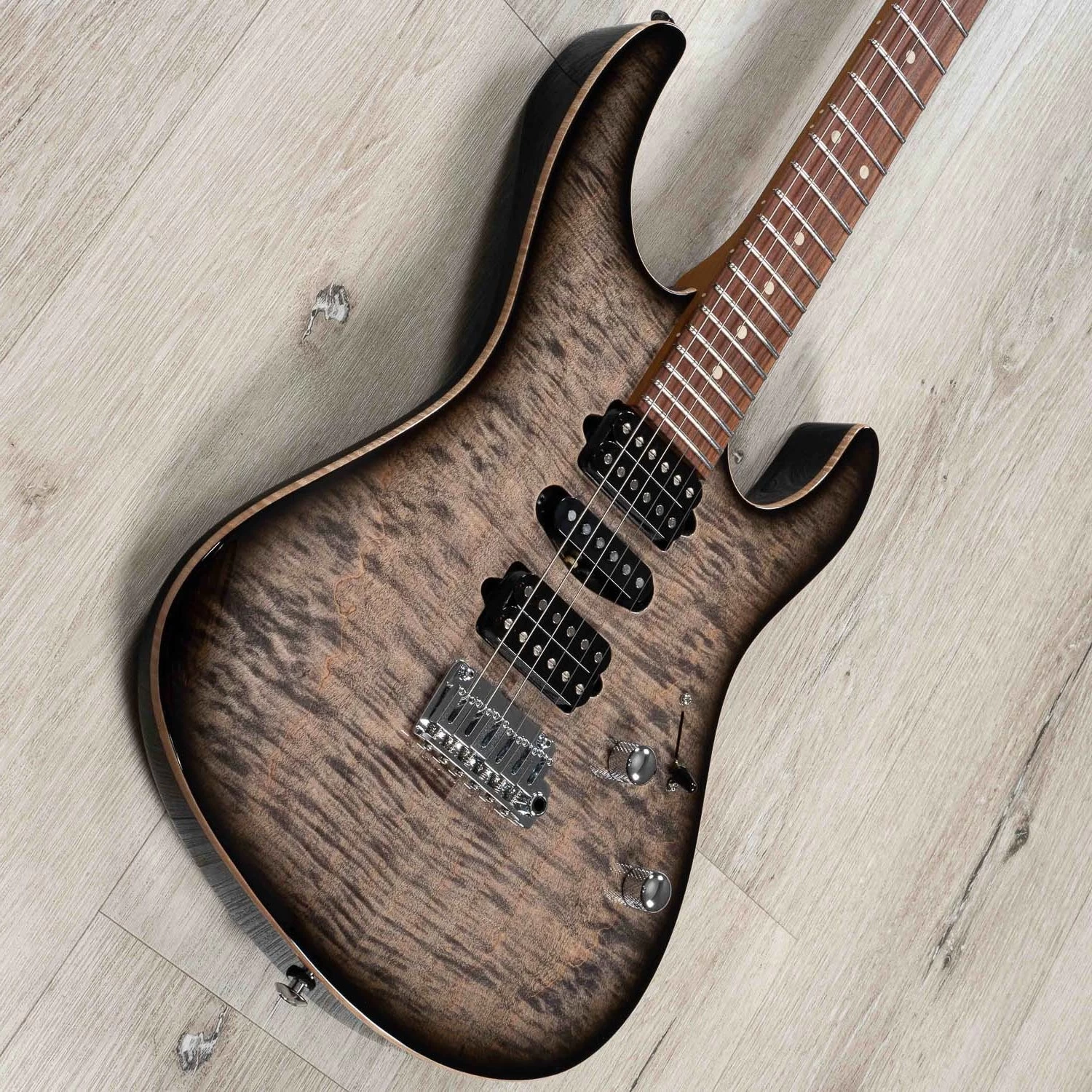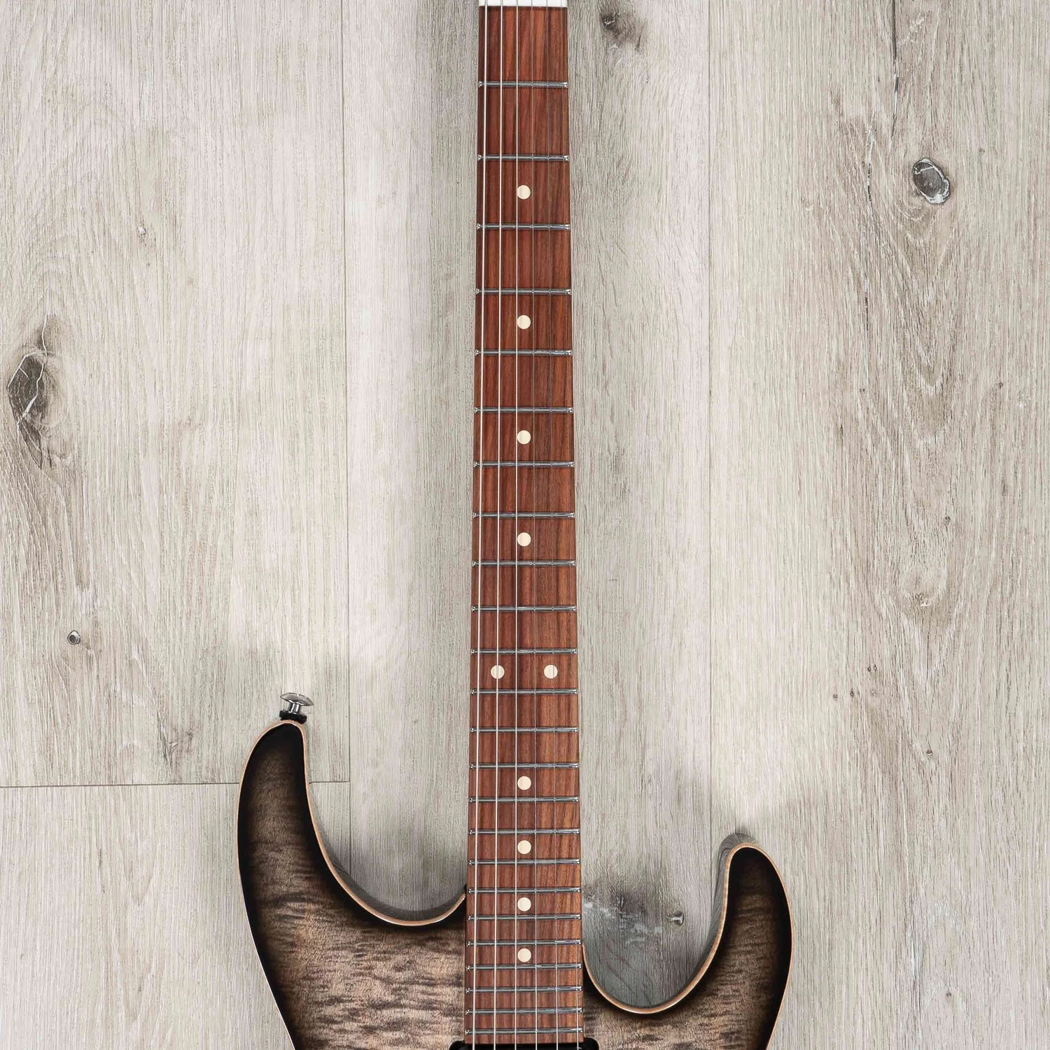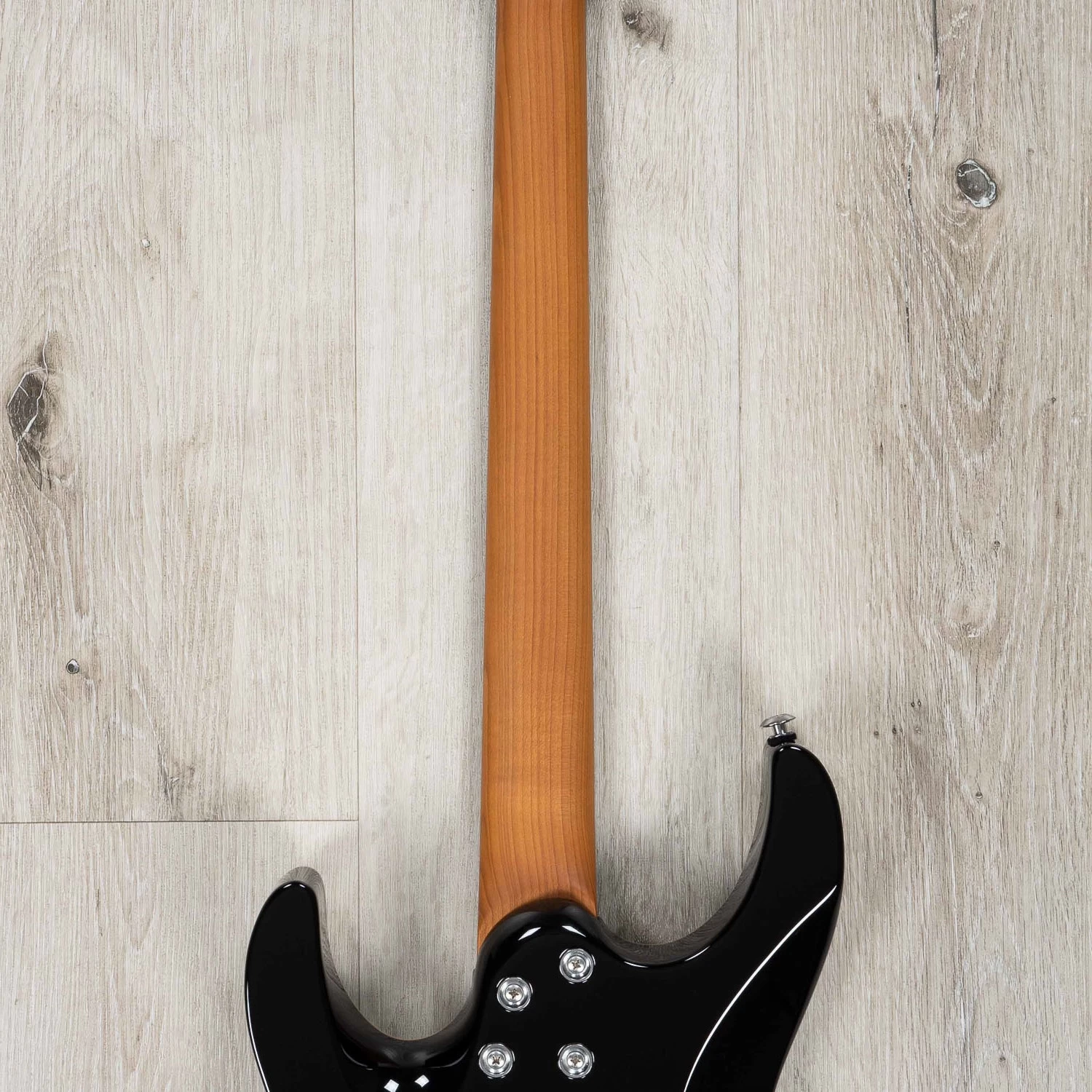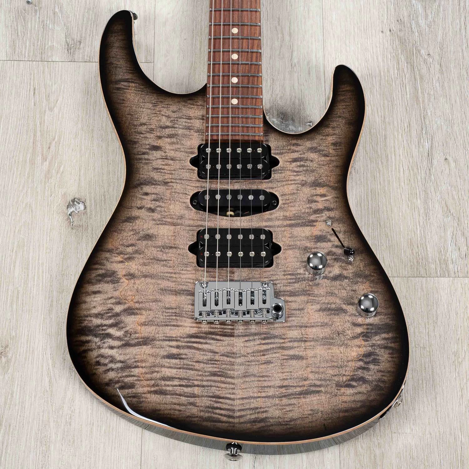 The new Suhr Modern Plus features a brand new roasted maple neck with pau ferro or maple fingerboard. The Modern Plus retains many of the original specifications of the Modern Pro including the sleek elliptical neck profile, balanced asymmetrical body, innovative neck heel and stunning flame maple top. Proprietary Suhr locking tuners and the Gotoh 510 tremolo provides superior tuning stability.