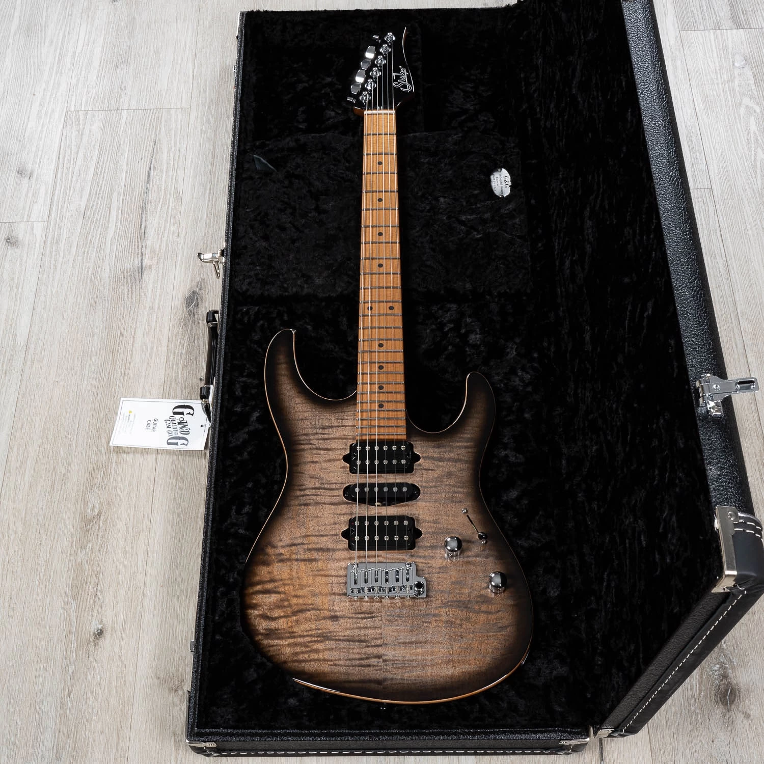 The new Suhr Modern Plus features a brand new roasted maple neck with pau ferro or maple fingerboard. The Modern Plus retains many of the original specifications of the Modern Pro including the sleek elliptical neck profile, balanced asymmetrical body, innovative neck heel and stunning flame maple top. Proprietary Suhr locking tuners and the Gotoh 510 tremolo provides superior tuning stability.