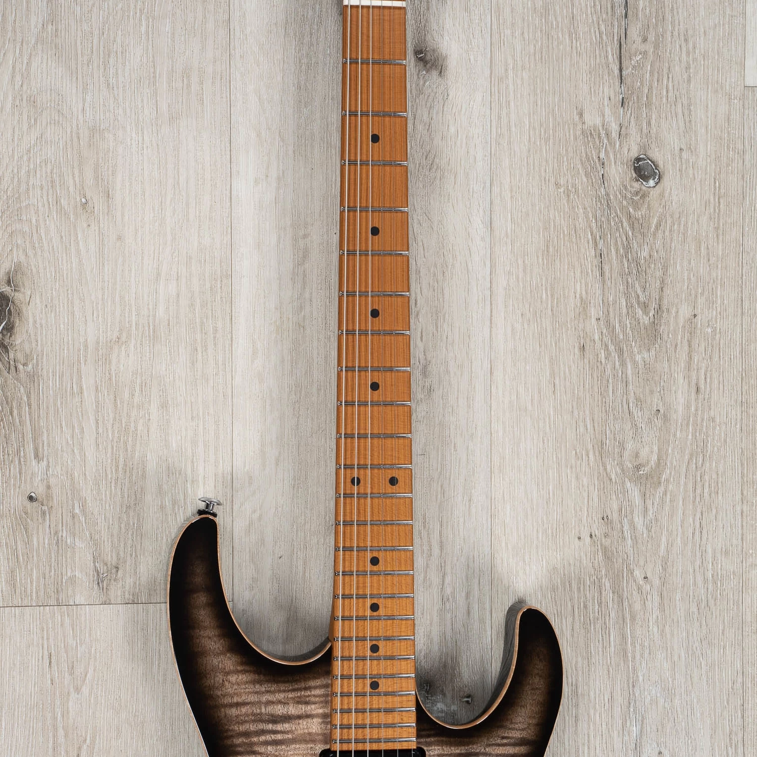 We’re stoked to present this stunning Modern Plus with a highly figured flame maple top and a striking Trans Charcoal Burst finish!