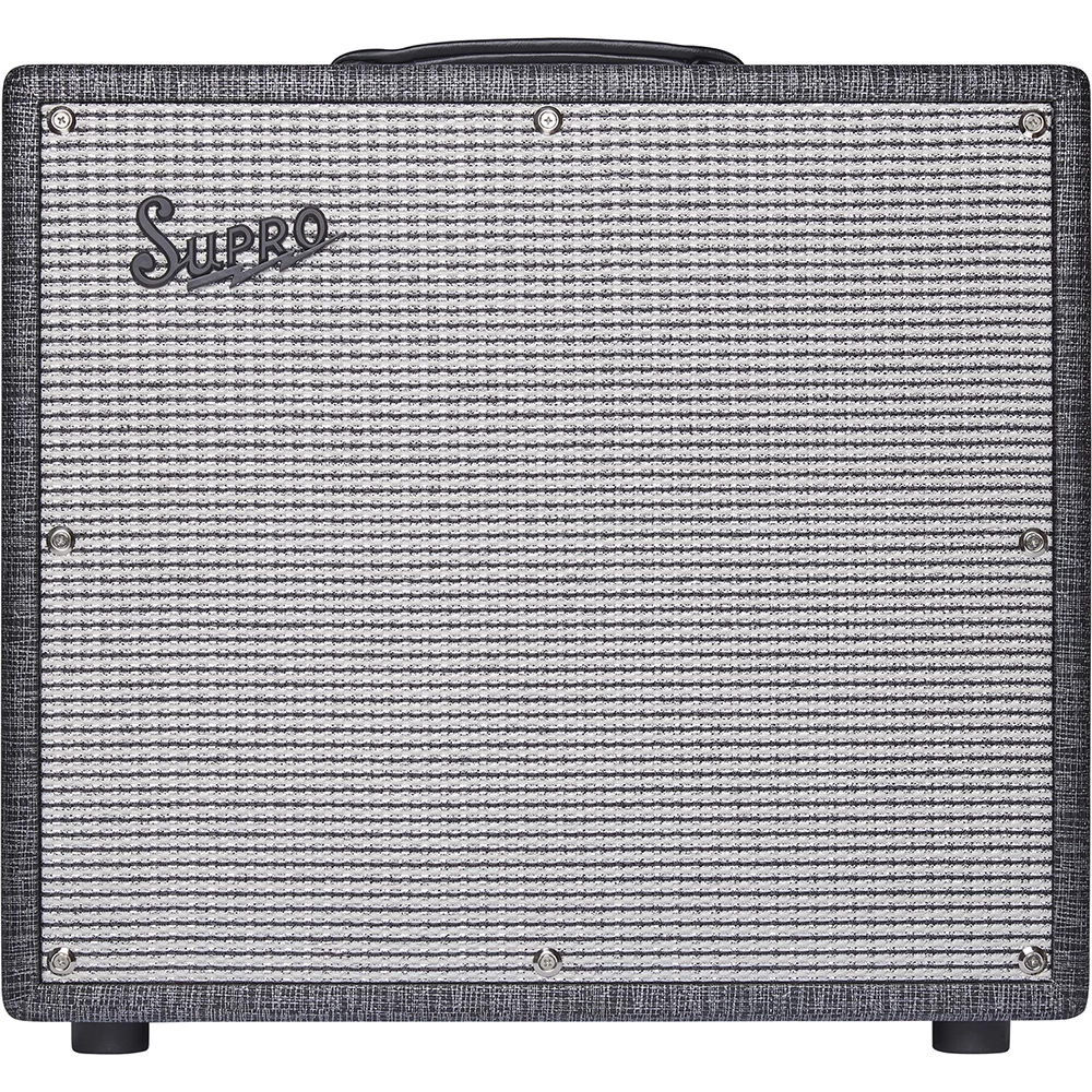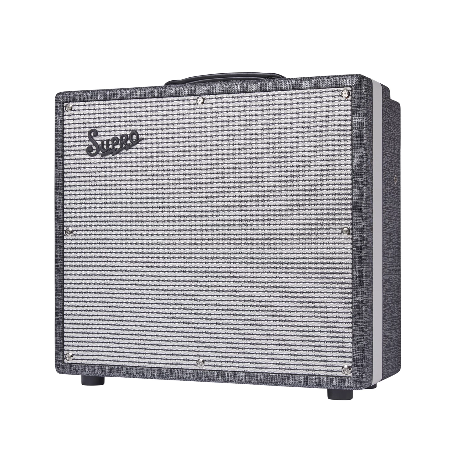 Our custom Black Rhino Hide tolex, Supro Silver/Black grill cloth with subtle sparkle, white welting, a dog bone handle, and engraved headplate for a premium look and feel.