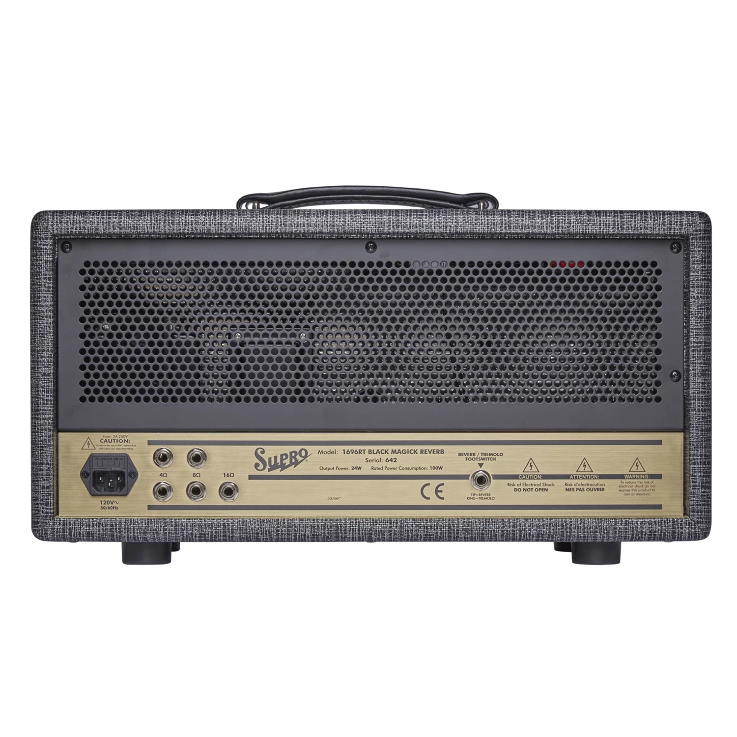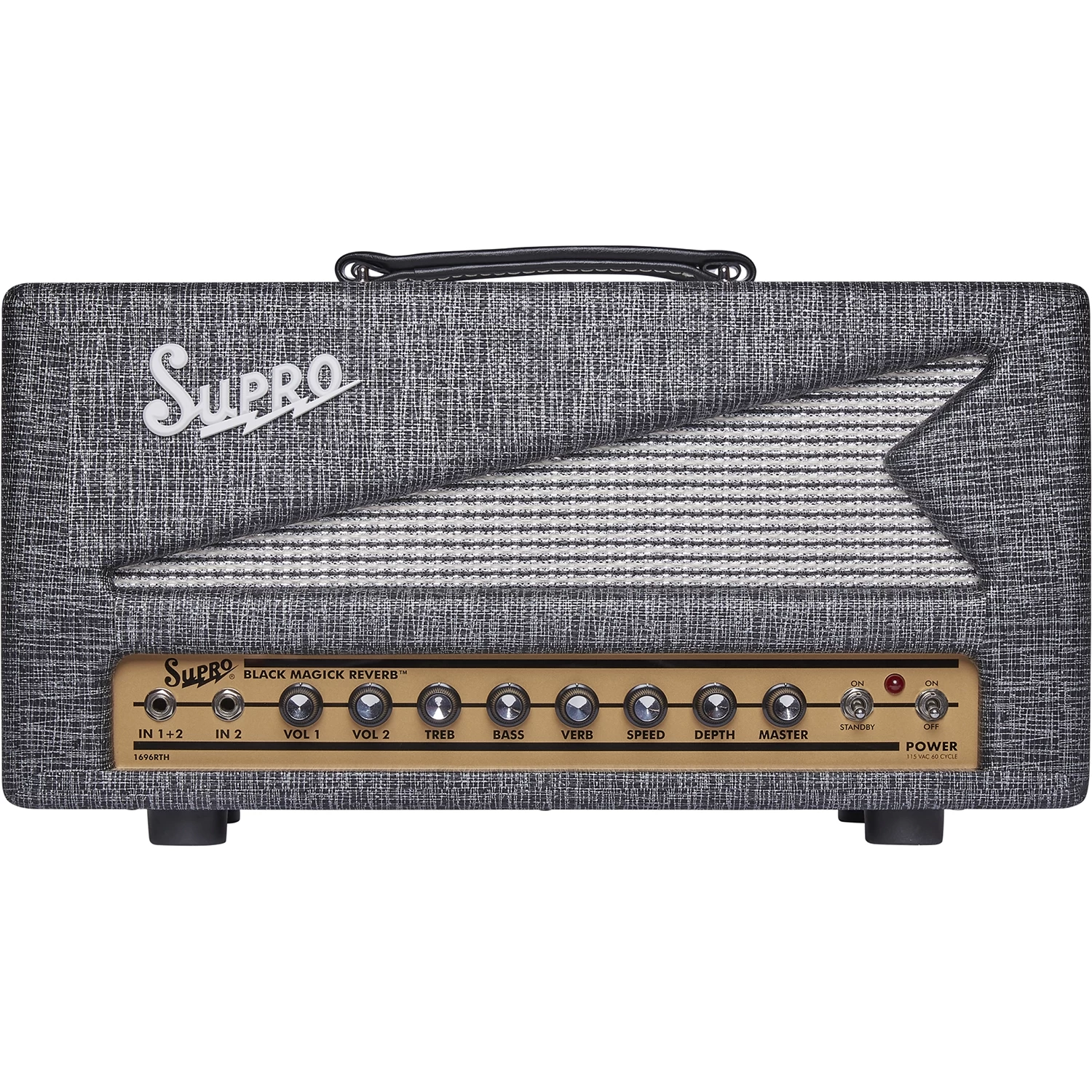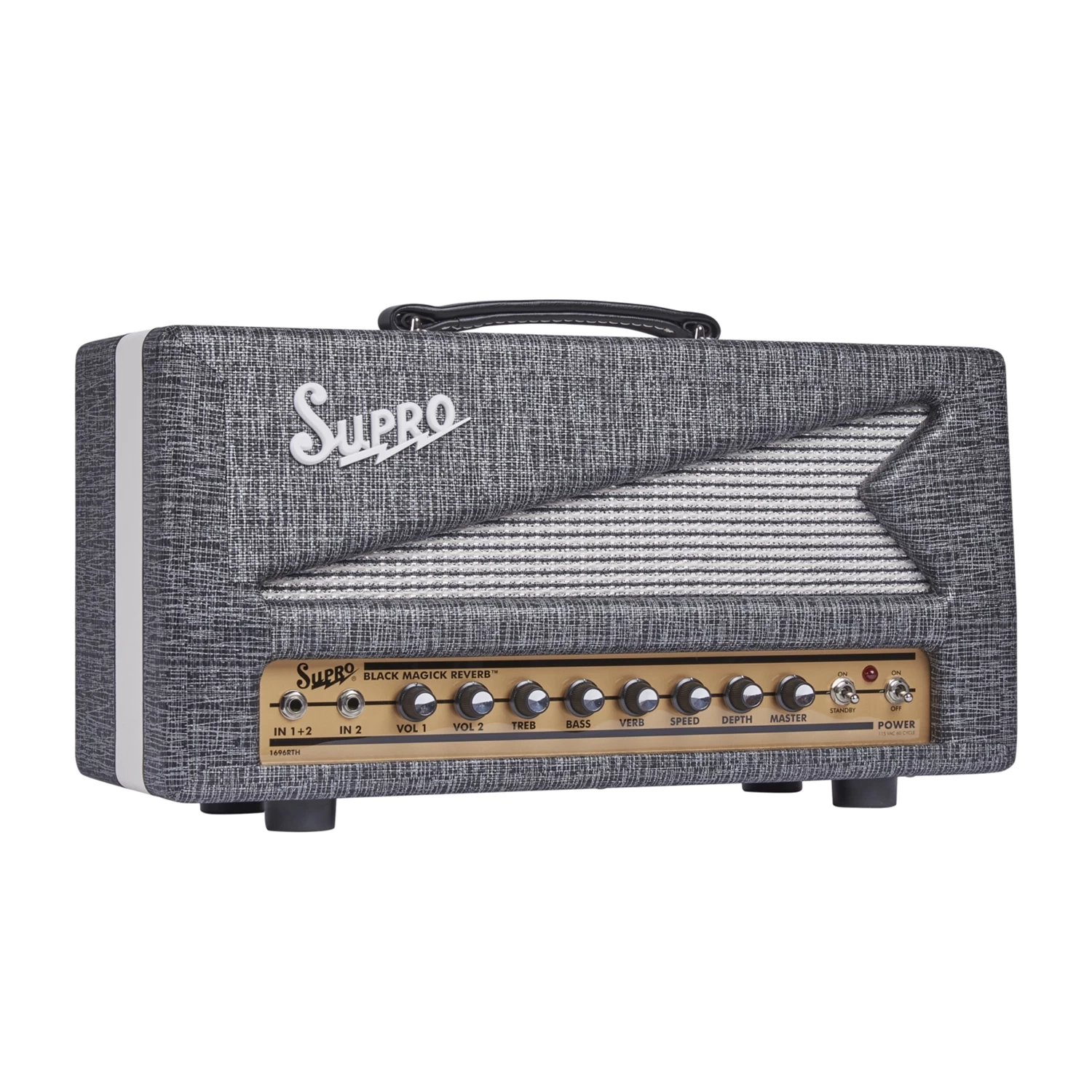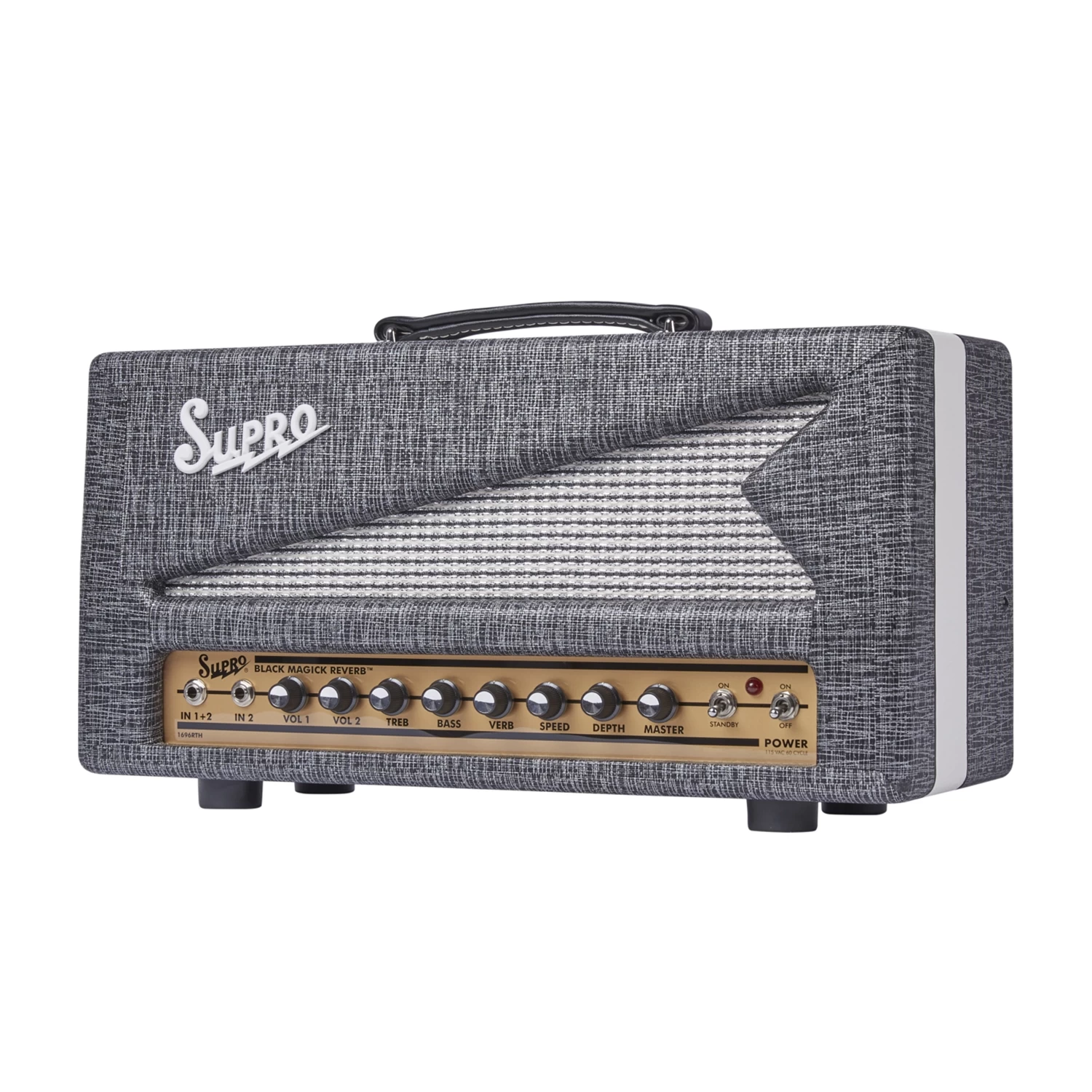 The Black Magick Reverb Head embodies the all-tube snarl and sweetness that define the Supro sound. Featuring analog spring reverb, 2-band EQ, and a master volume knob, the Black Magick Reverb was designed with maximum flexibility in mind. Two independent preamp channels can be linked together using the “1 + 2” input jack to obtain fat tone, while utilizing only Input 2 will yield a more agile sound. The Black Magick Reverb’s 3-spring reverb pan is driven by both channels and then summed with the dry signal just before the master volume control. An updated, tube-based LFO circuit provides bias-modulated output tube tremolo with double the speed range of the original Black Magick. Also available in combo format.