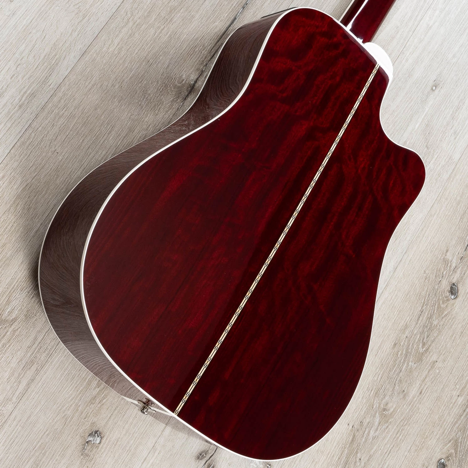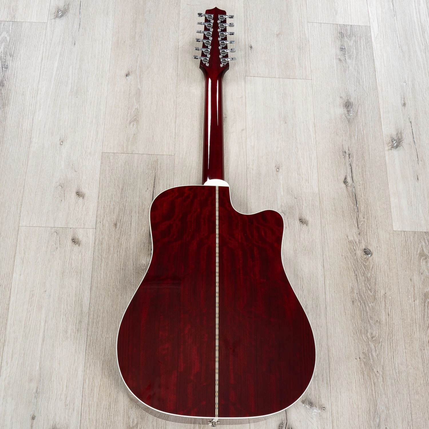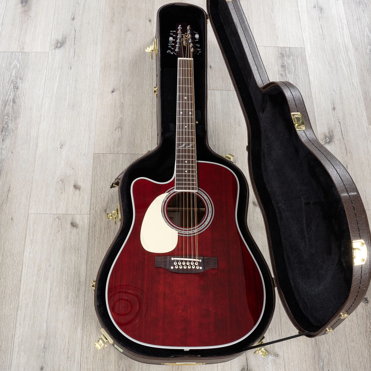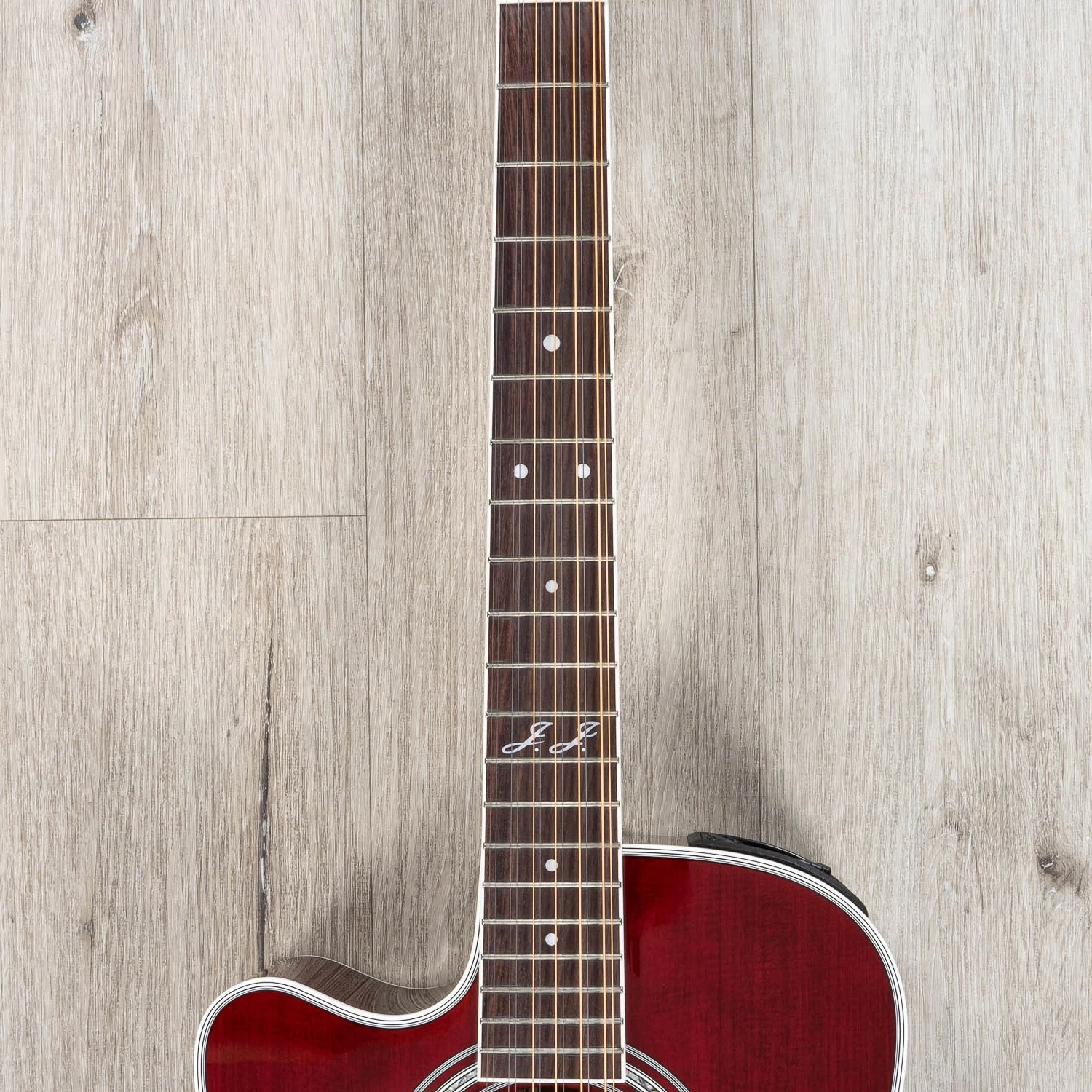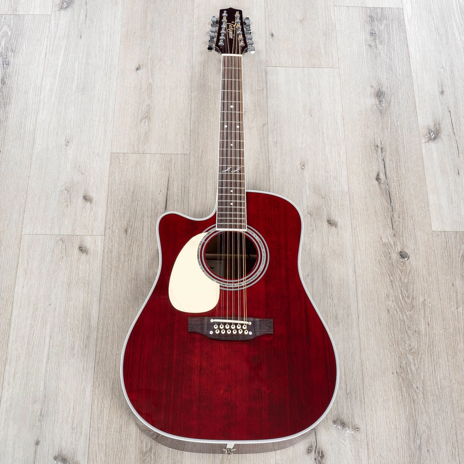 The 12-string J325SRC-12 dreadnought features a solid spruce top with ovangkol back and sides. The guitar is voiced to cover a broad tonal spectrum with depth for power and a shimmering upper midrange for articulation and clarity and features a gloss red finish, JJ inlay at the 12th fret and gold tuners with ivory buttons on the keys.