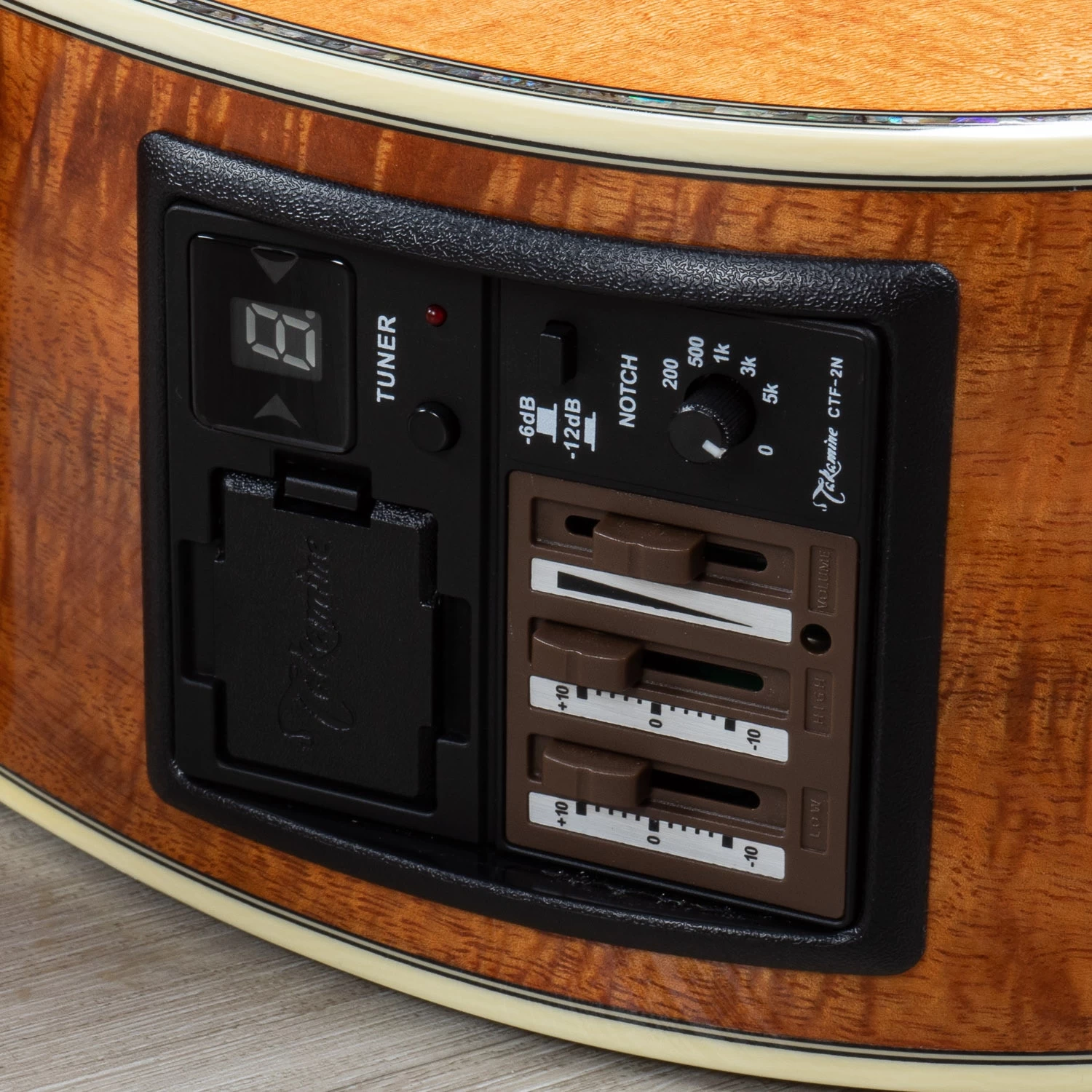 In the early days of Takamine’s 60 year history, there was a model made of Hawaiian koa that adapted the classical body shape to an x-braced concert steel string with a cutaway. LTD2022 takes this early Takamine guitar as a starting point, featuring a figured spruce top and figured koa on its back and sides. For its electronics, we return to our early roots with the new CTF-2N preamplifier which revives the sound of our early FET preamp model, affectionately known as the “Brownie”. The CTF-2N has that legendary sound, while adding the more modern functions of easy battery access, a chromatic tuner, and a notch filter. With Takamine’s 60th anniversary in 2022, the LTD2022 marks the occasion with a diamond-shaped inlay on the 12th fret, vibrant abalone purfling, and matching rosette. The position markers also feature a colorful abalone circle-within-a circle motif. Takamine produces all of our LTD models in limited quantities with unique features that will never be produced again. The LTD2022 is certain to be a treasured instrument for guitar players and instrument collectors alike.