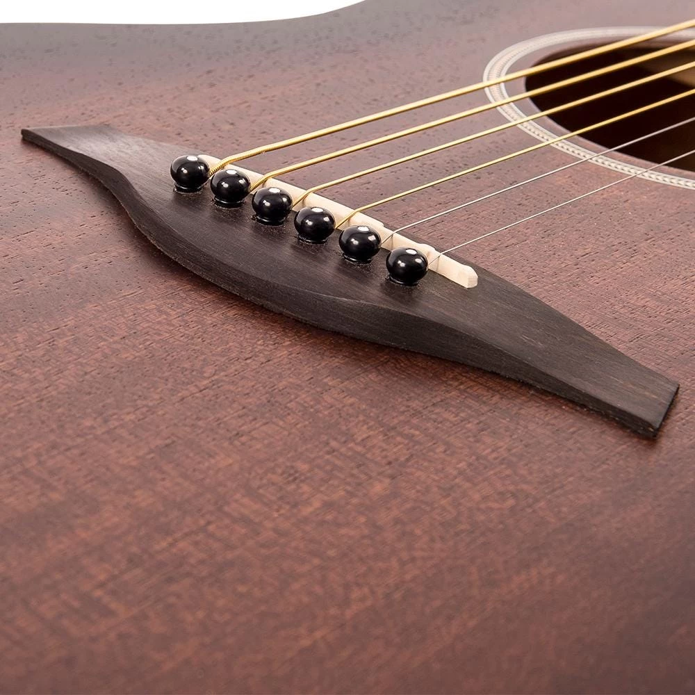 Available in dreadnought, concert and parlour body sizes, all models share that classic ‘bluesman on a budget’ theme, looking authentically cool in a satin matt, Whisky Sour finish highlighting the natural grain pattern of the all-mahogany construction and subtle soundhole rosette.