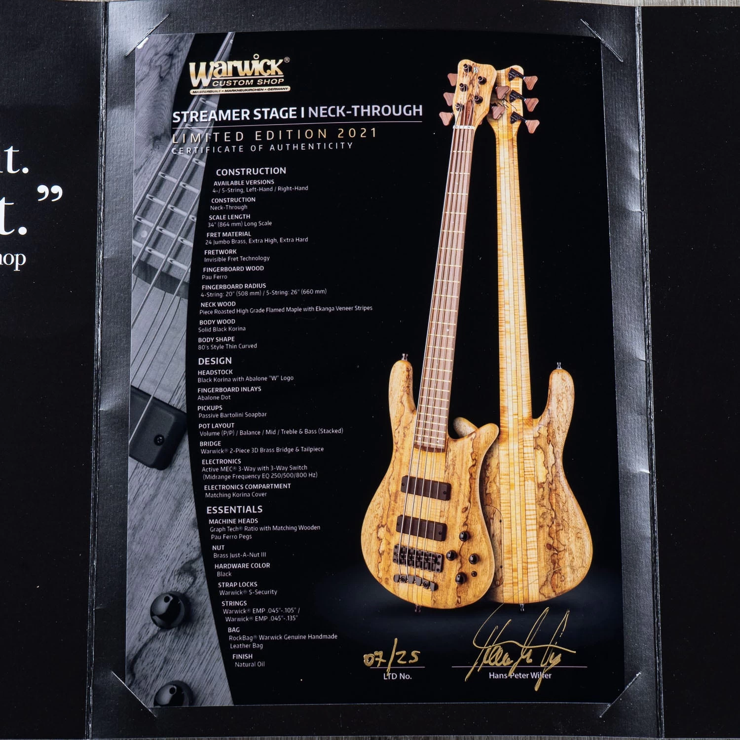 Music Store Live is proud to offer up this MasterBuilt limited edition 2021 Warwick Streamer Stage I. Lucky number 7 out of 25 worldwide (includes 4 and 5-string versions), this is a true rare bird and a collector’s piece, for sure.