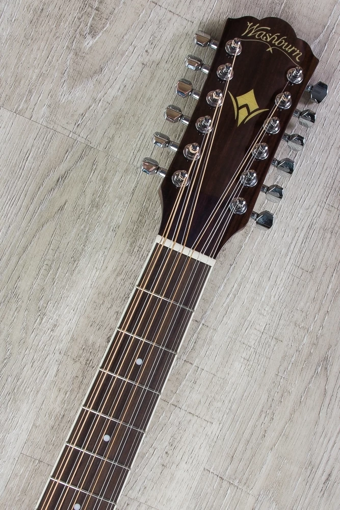 The HD10SCE12 is a dreadnought cutaway 12 string acoustic guitar. It feature a solid spruce top for superior tone that improves with age, mahogany back, sides and neck, a rosewood fingerboard and bridge, diecast tuners for quick, easy and accurate tuning, a Washburn tortoise pickguard and a custom rosette. The cutaway makes it easy to reach the uppermost frets. With its built in premium Fishman 301T Tuner/Preamp, you’ll never have to carry a tuner with you and it’s plug-in ready.